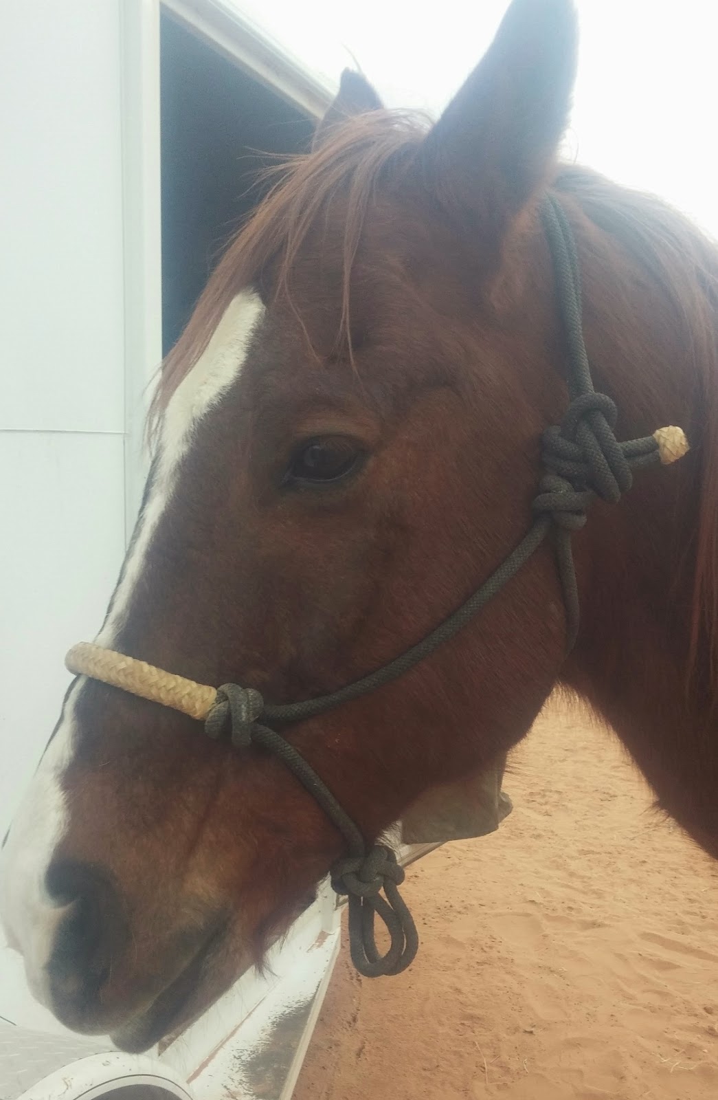 I use 5/16th inch (8mm) polypropylene rope halters. Like the one on Junior in the picture above - he's sticking his tongue out cause he saw me with a camera. Most of mine are from Double Diamond Halters but a few are from Craig Cameron. Same type of quality. I don't have nose buttons (knots) on my halters,..no particular reason, but I haven't seen a need to go out and get a halter with nose buttons. Besides I would think that the pressure of the rope halter on the horse's poll (on the top of his neck behind his ears) is sufficient enough to make nose buttons redundant. Just my opinion. There are probably people who think highly of rope halters with nose knots and maybe I just haven't yet met the horse who can benefit from knots on the nose band of the halter.